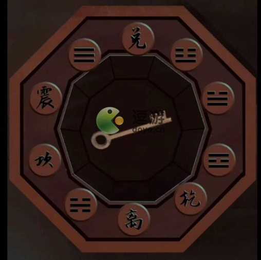 7、上楼走个小剧情,出当铺门到外面右边墙上放上【卦象解析&金钱剑图画】得到方位[坎东方],上楼用【奇型钥匙】打开门,左边桌子上得到【开山斧】,旁边盒子打开得到【钥匙】