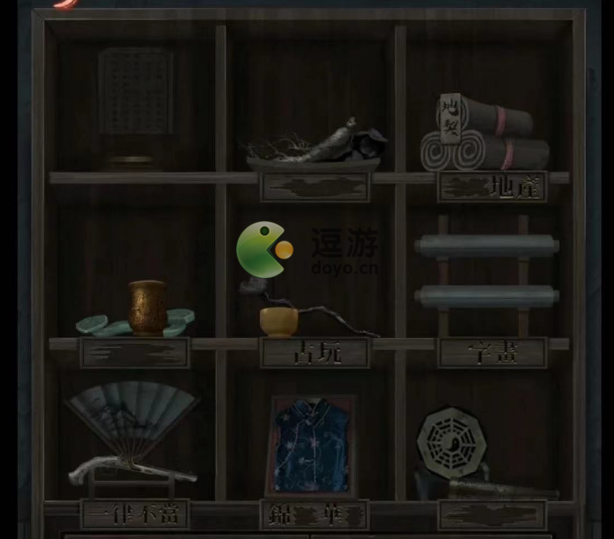 得到【卦象解析&印章杆】,【印章杆】放到正对的柜子上面的印章上,完成游戏(走迷宫)印章掉下去,按一下铜钱〈小高能〉得到【楚霸王戏偶】